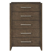 This elegantly designed 5-drawer chest provides exceptional vertical storage and a sophisticated touch to any bedroom. Expertly crafted from a blend of solid rubberwood and durable plywood, this chest promises long-lasting stability and resilience. The rich, dark walnut finish offers a warm and inviting aesthetic, seamlessly integrating with both traditional and contemporary interior dcors. Featuring five spacious drawers, each constructed with sturdy dovetail joints and equipped with smooth ball-bearing glides, organizing your clothing and personal items has never been easier or more efficient. The sleek polished chrome-tone bar pulls provide a modern contrast, elevating the overall design of this truly functional and refined piece.