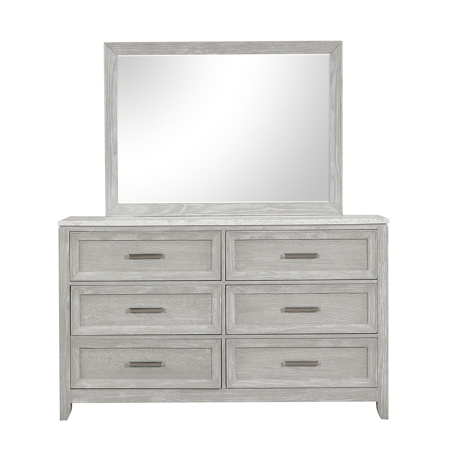 Crafted with precision, the Fiona 6 Drawer Dresser seamlessly combines the beauty of real wood with durability. Its construction features Acacia Solids, Manufactured Woods, and Oak Veneer, ensuring strength and stability. The multi-step finish, achieved through wire brushing and white glazing, enhances the natural wood grain, resulting in a light, clear mist gray finish. The dresser’s design showcases sophisticated details, including picture frame moldings, tapered legs, and sleek drawer pulls. On top, a genuine white and gray marble surface adds a rich accent that complements the wood finish. Whether your decor leans traditional or contemporary, the transitional style of the Fiona dresser effortlessly fits in. Practicality meets elegance with time-tested drawer construction. French front and English back dovetail joinery ensures strength, while full-extension glides allow smooth operation. Thoughtful extras include sanded and sealed drawers to prevent clothing snags, and a felt-lined top drawer to protect delicate items.