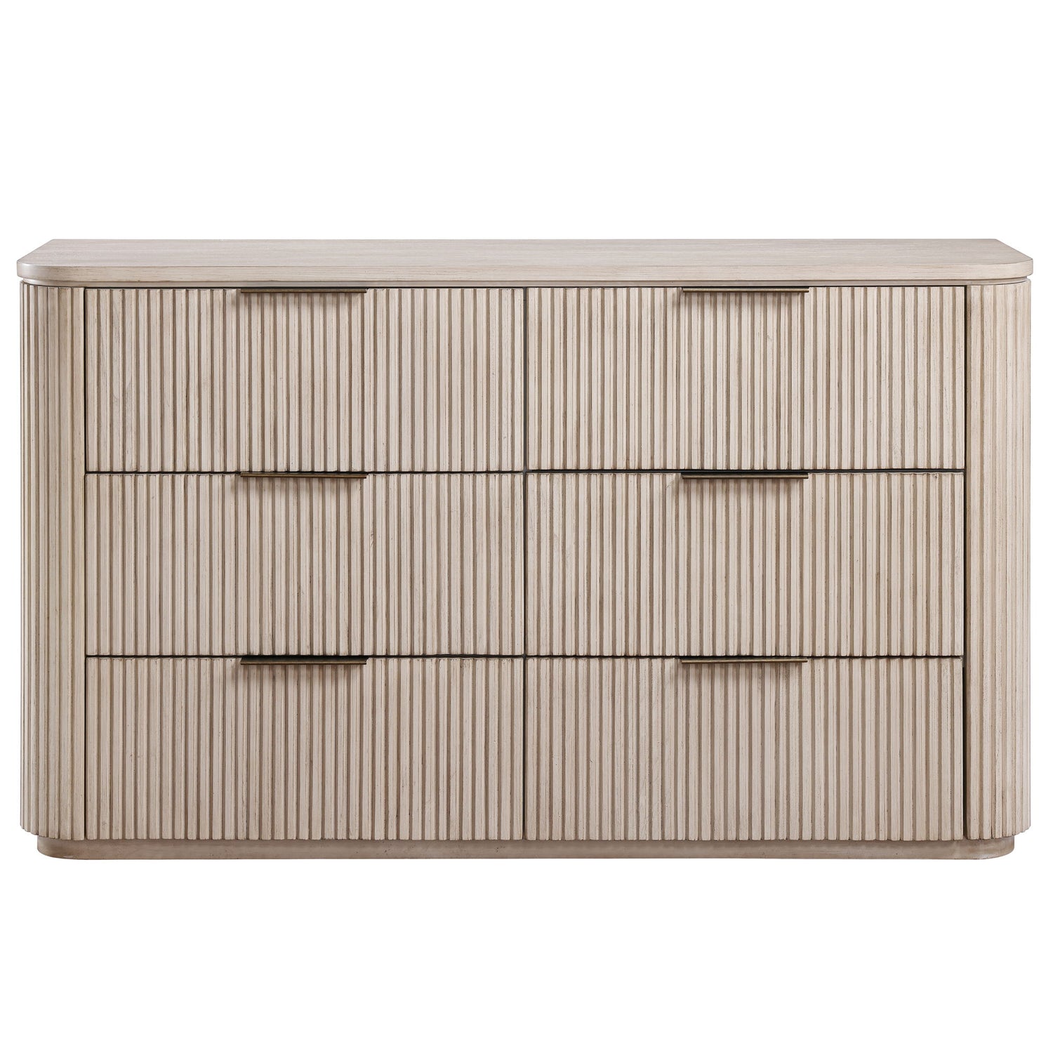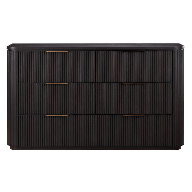 The Henry 6-Drawer Reeded Dresser offers modern elegance and ample storage. Crafted from oak veneers, Asian hardwoods, and engineered woods, it features reeded surfaces, rounded corners, and a sturdy plinth base. The six drawers, including a felt-lined top drawer, provide organized storage for essentials.