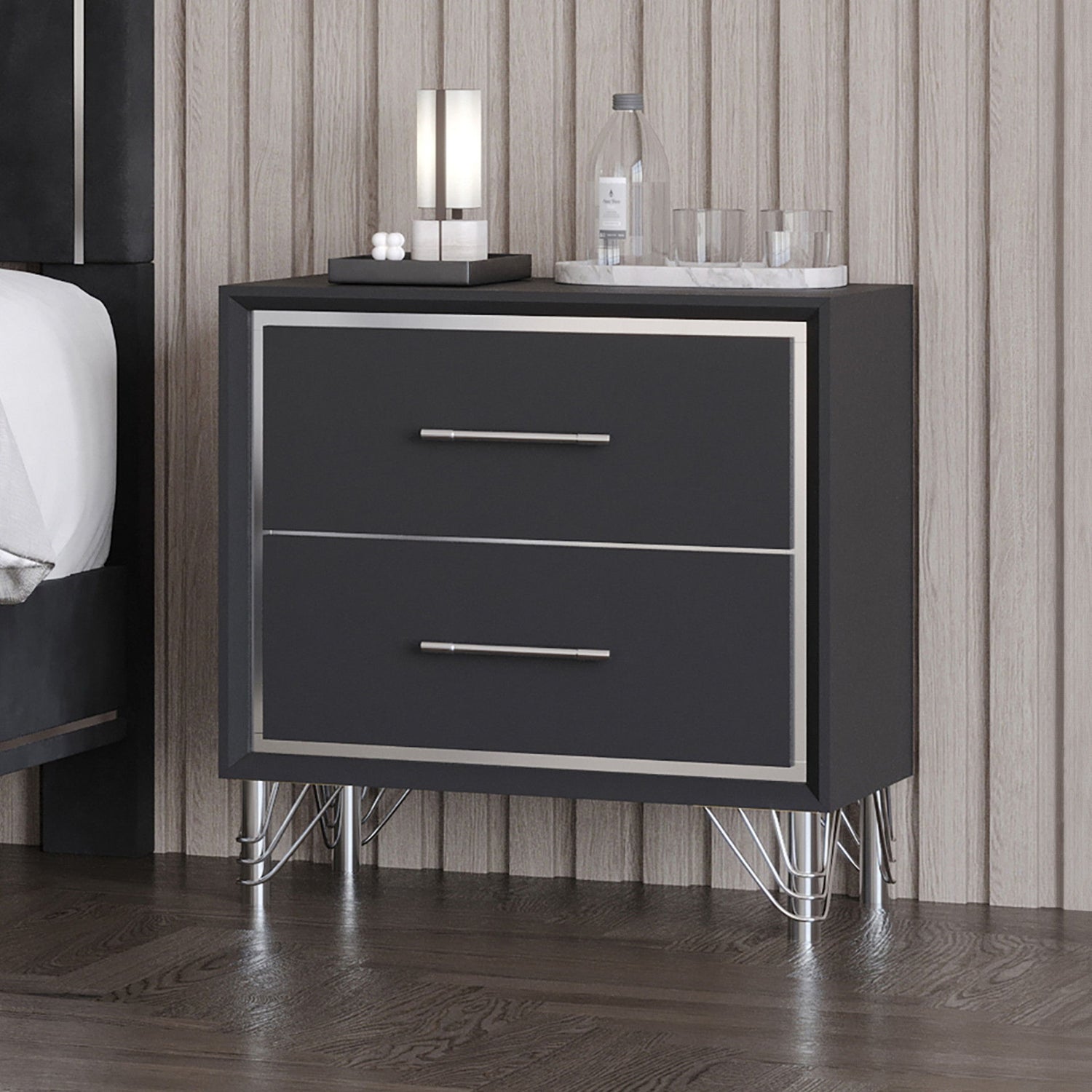 The Ava 2 Drawer Nightstand in Ebony blends modern glamour with everyday functionality. Crafted from engineered wood with eco-friendly black laminate, it features silver mylar accents and sculpted legs for a chic finish. Two spacious drawers offer smooth operation with English dovetail joinery and Kenlin ball-bearing glides. A stylish and practical piece that adds a touch of sophistication to any bedroom.