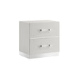 The Europa 2 Drawer Nightstand in white combines sleek, modern design with practical functionality. This nightstand features a gleaming white finish, mylar accents, and acrylic drawer pulls for a sophisticated look. Constructed with eco-friendly manufactured woods, it is built for durability, with surfaces finished in a glossy white topcoat. Upscale extras include a silver mylar pedestal base that elevates the glamour of this piece. The drawers are well-constructed with dovetail joinery and ball bearing glides, ensuring a durable, easy-glide operation, with interiors finished for snag-free storage. The two-drawer nightstand provides ample storage for all your bedside essentials. Choose the Europa 2 Drawer Nightstand for a blend of contemporary style and practical design.