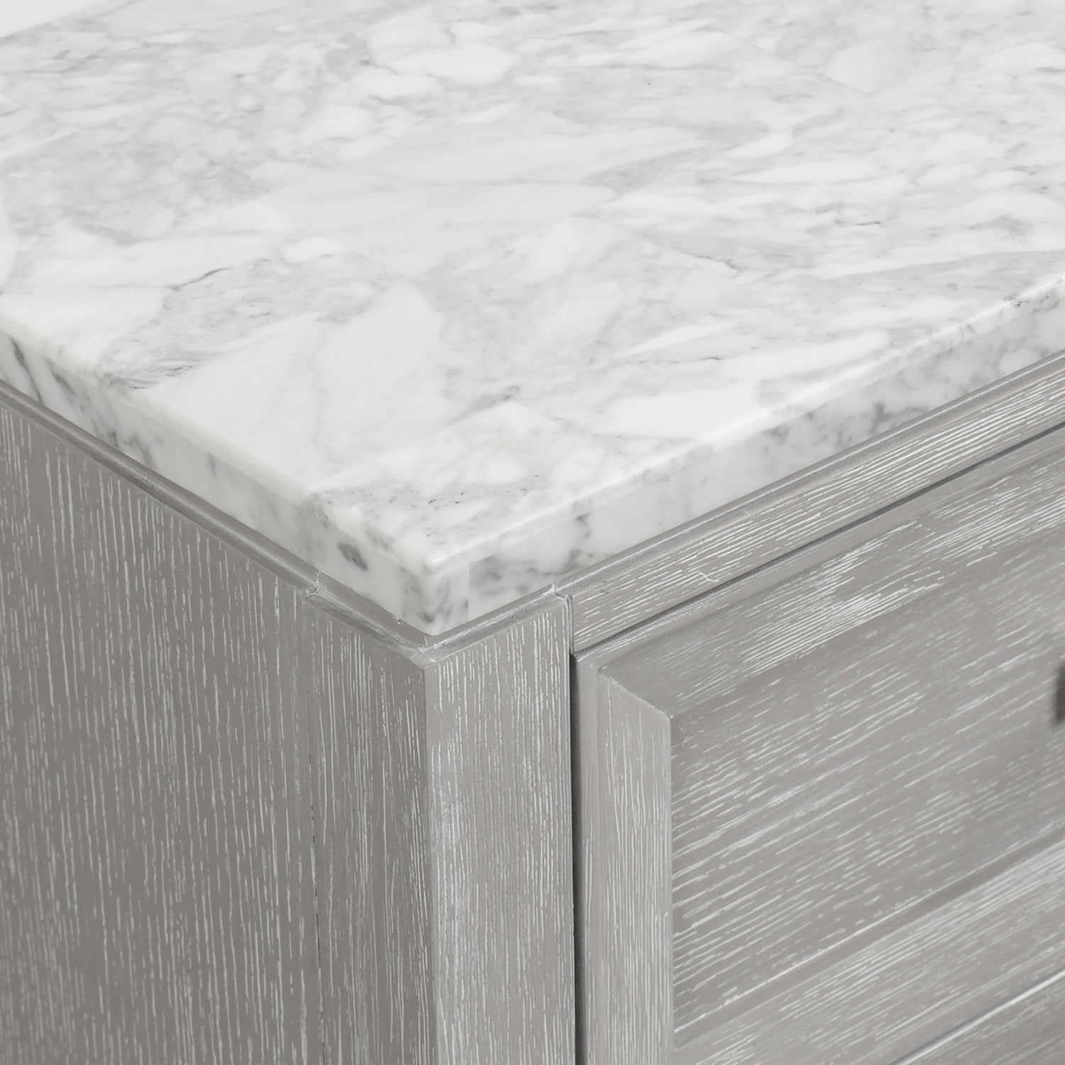 The Fiona Nightstand combines durability with timeless design. Crafted from Acacia Solids, Manufactured Woods, and Oak Veneer, it seamlessly blends the beauty of real wood with robust construction. The multi-step finishing process, including wire brushing and white glazing, results in a light, mist gray finish that enhances the natural wood grain. Sophisticated Details such as picture frame moldings, tapered legs, and sleek drawer pulls showcase its classic aesthetic. The genuine marble top, in elegant white and gray, adds a rich accent and perfectly complements the wood finish. Whether your decor leans traditional or contemporary, the Fiona Nightstand’s transitional style effortlessly fits in. Practicality meets craftsmanship with time-tested drawer construction. French front and English back dovetail joinery ensures strength, while full-extension glides allow smooth operation. Thoughtful extras include sanded and sealed drawers to prevent clothing snags, and a felt-lined top drawer to protect delicate items. The Fiona Nightstand is a versatile addition to any bedroom, combining style and functionality.