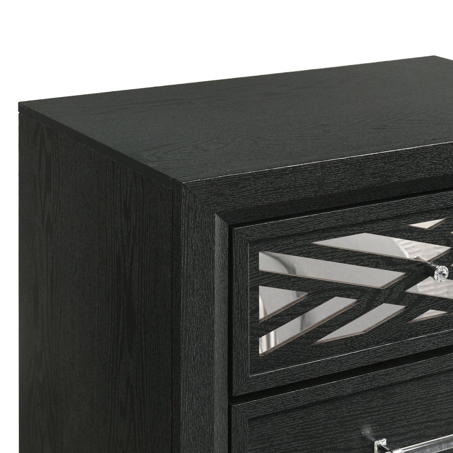 The Obsidian 2-Drawer Nightstand in Black is a striking blend of modern elegance and practical design, perfect for complementing any bedroom decor. Crafted with meticulous attention to detail, this nightstand is made from premium solid Rubberwood, enhanced with manufactured woods and veneers, ensuring both lasting beauty and the durability of genuine wood. Its sleek design is highlighted by clean lines and a chic, low-sheen black finish that exudes bold sophistication. The geometric cut-outs, backed with mirror-like Mylar, introduce a touch of luxury and modern glamour, making this piece both functional and visually appealing. The nightstand features two smooth-gliding drawers, equipped with durable Kenlin Glides and stylish acrylic drawer pulls. Each drawer is expertly crafted with quality dovetail joinery and finished interiors, providing a snag-free, elegant storage solution for your bedside essentials. This nightstand is the perfect combination of fashion and function, adding a touch of refined style to your bedroom.