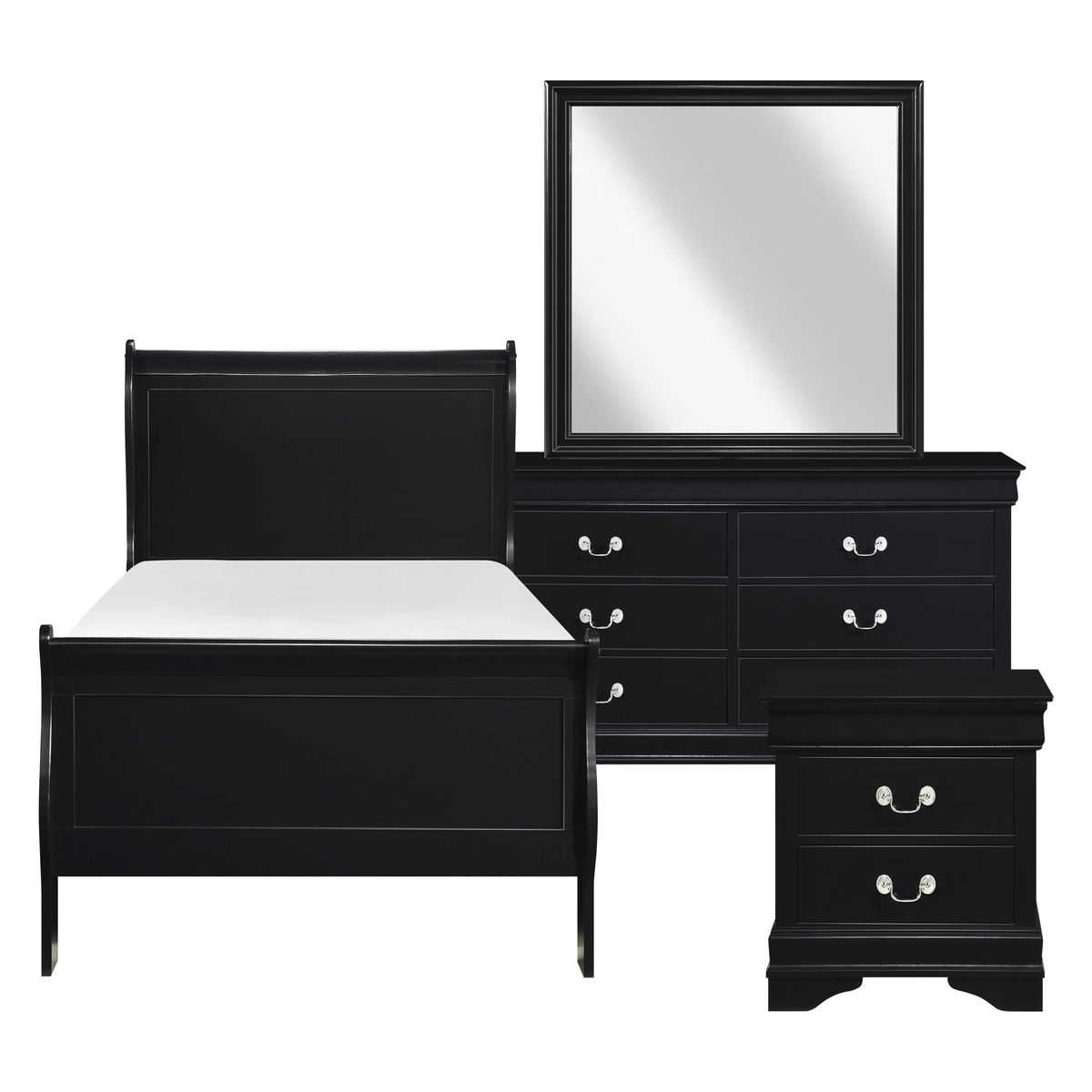 Black / 4 Pc. Bed, Dresser, Mirror, Nightstand / Twin