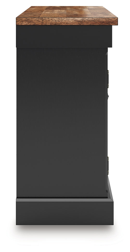 - Top with butcher block veneer pattern in deep brown wood tone finish