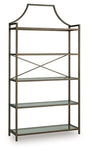 Classic design effortlessly blends with modern functionality in this elegant bookcase. Its antiqued bronze-tone finish adds a touch of warmth and sophistication, while the clear glass shelves create an airy and spacious feel. It’s exactly what you’ve been searching for to display your treasured books, digital picture frames or decorative accents.