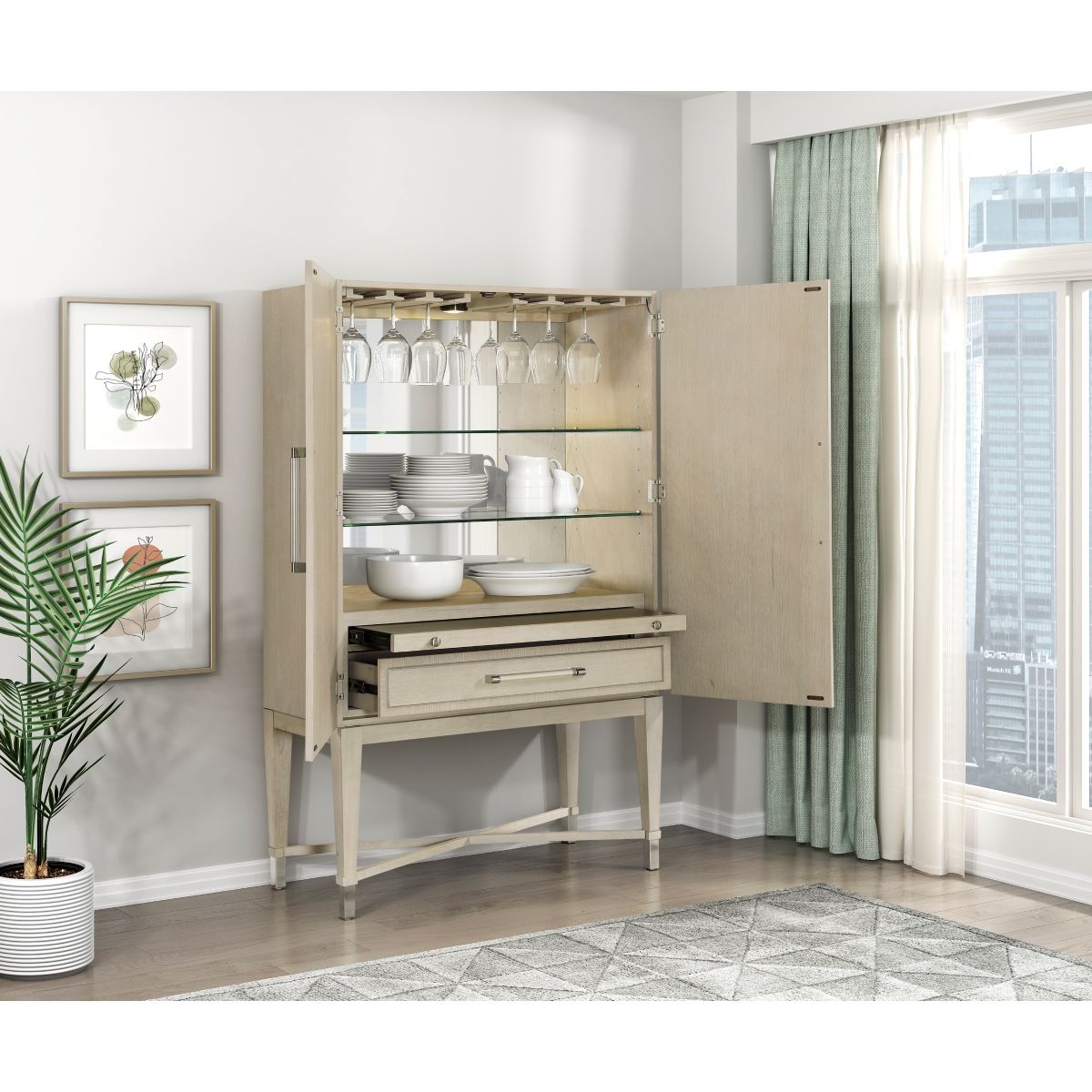 Elevate your home entertaining with this sophisticated bar cabinet, finished in a stylish light oak that complements any dcor. Crafted with a blend of oak veneer, solid wood, engineered wood, and glass, this piece offers both durability and refined aesthetics. The thoughtfully designed interior features a mirrored back panel enhanced by integrated LED lighting, creating a stunning display for your spirits and glassware. Organization is effortless with the under-shelf stemware rack, two adjustable glass shelves for versatile storage, a smooth-gliding dovetail drawer for accessories, and a convenient pull-out serving tray. The nickel-tone bar pull with a clear acrylic accent adds a touch of modern elegance to this essential piece for any home bar or dining area.