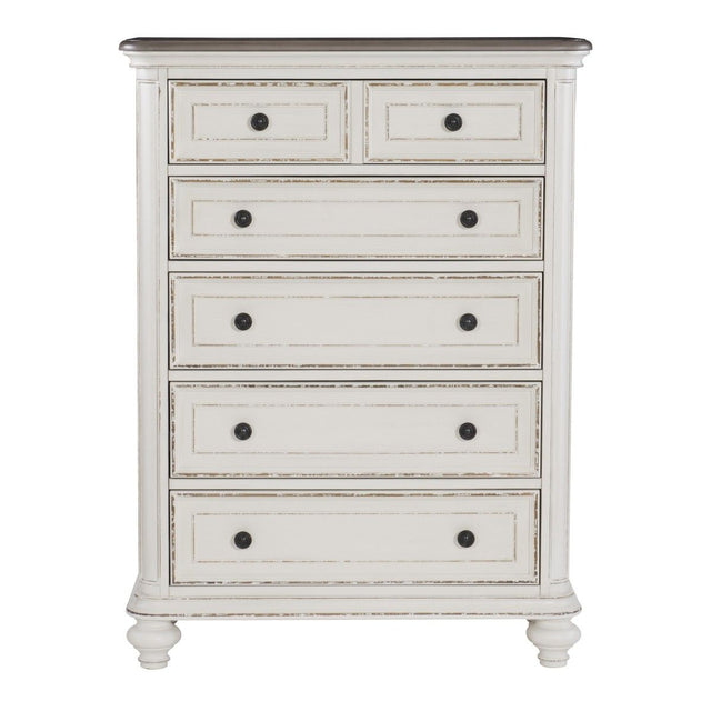 Soft, sweeping curves define the elegant profile of the Baylesford Collection. The chest is softened by an antique white rub-through finish with a brown-gray finished framed-plank top, creating a romantic aesthetic will place beautifully within your bedroom. Dark finished metal knob hardware provides complementing contrast to the drawer fronts.