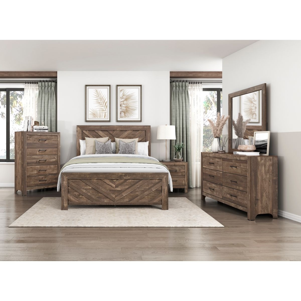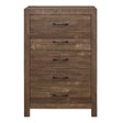 Modern lines and rustic styling are paired to create the look of the Corbin Collection. The embossed faux-wood veneers texture is highlighted by a rustic finish for a realistic wood look. Providing complementing contrast, the drawer fronts of the chest feature metal hardware. Subtle framing defines the profile of the chest, further lending to the unfettered design of the collection.