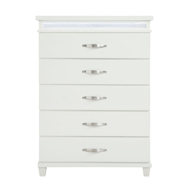 Elegance is beautifully captured in the design of the Kidman Collection. Inset faux crystal banding and LED backlights provide accent to the chest creating a reflective glow against the white finish. Polished chrome bar hardware fronts each drawer face of the chest.