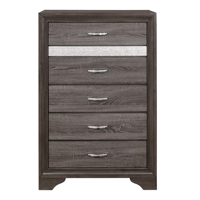 The unique styling of the Luster Collection presents a glamorous option for your bedroom. The chests embossed faux-wood veneer features a finish that allows for the acrylic silver glitter front of the hidden jewelry drawer to shine. The jewelry drawer features felt lining to protect your hidden items from wear and tear. Polished chrome bar drawer pulls front the drawers providing complementing contrast to the collections finish.