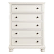 Casual transitional styling lends versatility to the placement of the Laurelin Collection in a number of bedroom settings. The white finish can transition from traditional to country casual, with antiqued bronze knob hardware punctuating the look of each framed drawer front and bun feet providing support.
