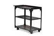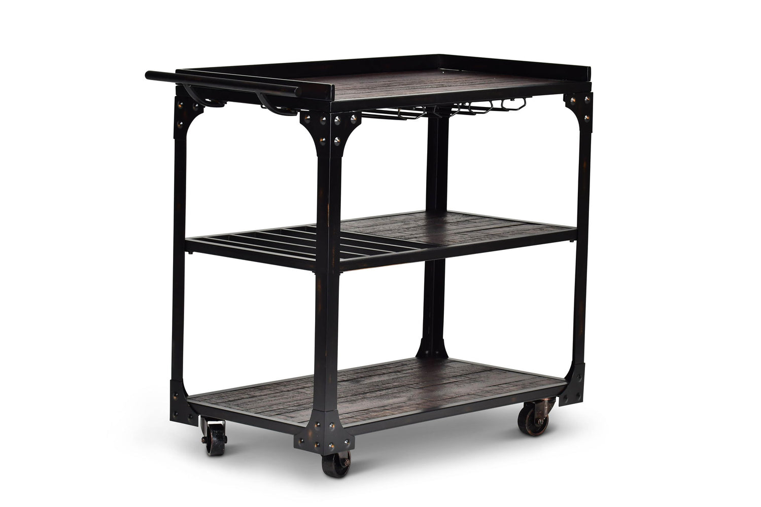 The bar cart in the Sherlock collection offers rustic styling in a rugged mix of hardwood solids and iron with a dark charcoal finish. The bar cart offers plenty of functionality for hanging stemware and bottle storage with casters for easy mobility.Pair with Sherlock tables for a great looking living area combination.