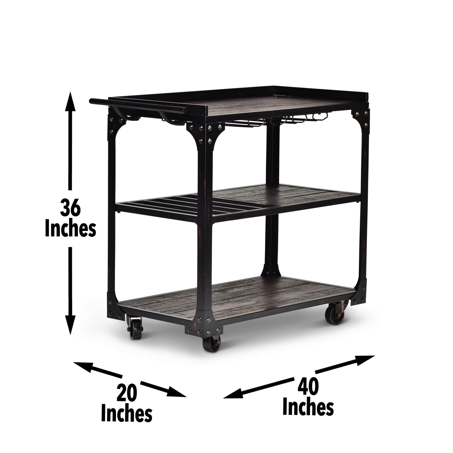 - Cart features casters for easy mobility, hanging stemware storage, push handle, rack for bottle storage and shelves for storage.