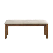 With its transitional style the Bonner Collection presents as the perfect addition to your casual dining room. Solid pine lays a foundation for the acacia veneer of the group, with a brown finish lending highlight to the distinct veneer pattern. This wood-framed bench features a beige-hued fabric seat.