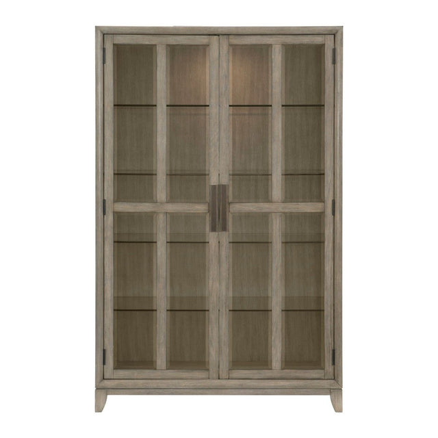 The sophisticated modern styling of the McKewen Collection brings refined design to the elegant space of your dining room. The oak veneer is finished in gray finish that is perfectly complemented by the vertically mounted nickel-finished metal hardware that centers each drawer and door front. Providing ample storage for your tabletop accessories is the available china, which features glass fronted doors and shelves that allow for dramatic display.