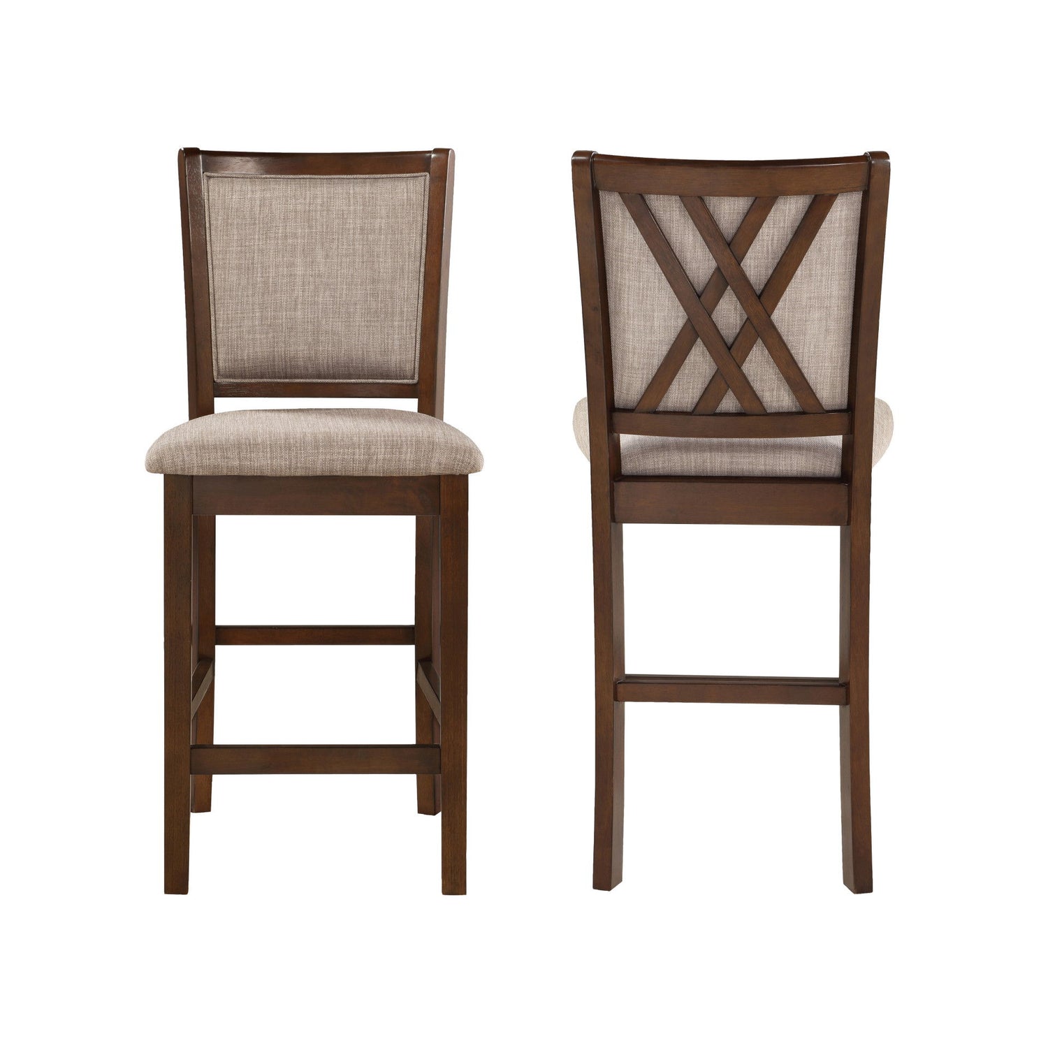 The Amy counter chair is designed to bring a perfect blend of durability, comfort, and style to your dining room. Included in this set are two counter chairs along with all the necessary hardware and assembly instructions for effortless setup. Crafted from solid Rubberwood, these chairs embody both the long-lasting and the inherent beauty of wood construction. The resilient and attractive upholstery features 100% polyester fabric, covering the seat and back cushions for a comfortable and lasting seating experience. Supported by solid wood legs reinforced with base stretchers that cleverly double as footrests, these counter chairs are built to last. The stylish design elements, including tapered legs, double X-back wood detail, weathered edges, and plush cushions, create a relaxing and distinctive chair that seamlessly complements your dining space.