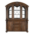 The grand scale of the Bergen Collection invokes a timeless aesthetic for your homes traditional dining room. The dark oak finish highlights the distinct oak veneer of the collection, while also lending contrast to the decorative accenting of the curios design. Faux keyhole hardware fronts the doors, while traditional bale hardware fronts the drawers. The wood doors of the buffet allow for enclosed storage of your tabletop accessories and decorative items. Traditional accenting abounds throughout the piece with classic routed pilasters, moldings, and decorative pediments gracing the design.