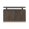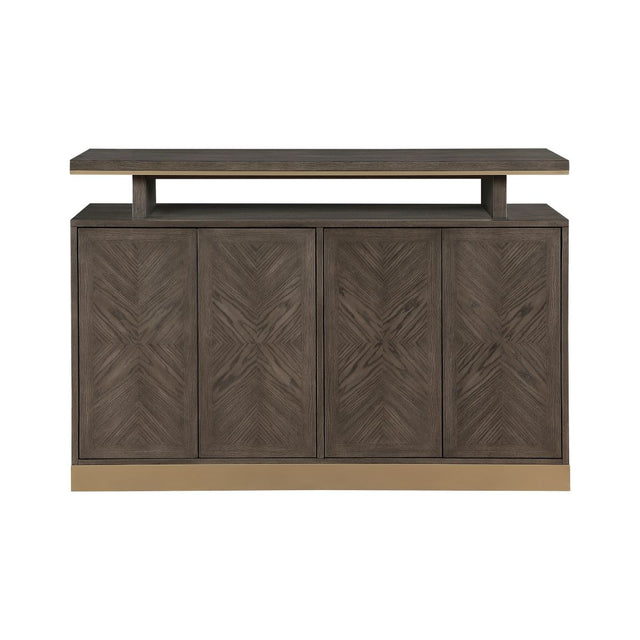Curating a space that reflects your love for modern lines and desire for a sophisticated aesthetic becomes reality with the addition of the Griffin Collection. A brown finish highlights the sunburst oak veneer pattern, its rich hue complemented by the gold finish metal banding that graces the servers floating top and base. Push-latch closures allow for hardware-less door fronts, and the floating top lends to the modern profile of the server, while behind door shelving provides ample space for storage of your tabletop accessories.