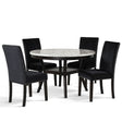 The Celeste Dining Set is an exquisite combination of modern sophistication and enduring craftsmanship. This set includes a chic round dining table with an espresso base and a faux marble top, accompanied by four stunning velvet chairs. Crafted from solid Rubberwood and high-quality manufactured wood components, the dining set is designed for longevity, ensuring a lasting addition to your dining space. The glossy finish on the tabletop provides both heat and water resistance, ensuring easy cleaning and protection from wear. The white and gray veined faux marble top, complemented by deep espresso legs, creates a contemporary and glamorous ambiance. Luxurious seating awaits with the soft and durable 100% polyester velvet fabric covering sumptuous memory foam cushions, offering both comfort and easy maintenance. Tailored for elegance, the rich and luxurious colors of the velvet chairs are enhanced by silver nailhead trim, providing a sparkling final touch to this impeccable dining set. Elevate your dining experience with the Celeste dining set—a fusion of contemporary glamour and enduring quality.