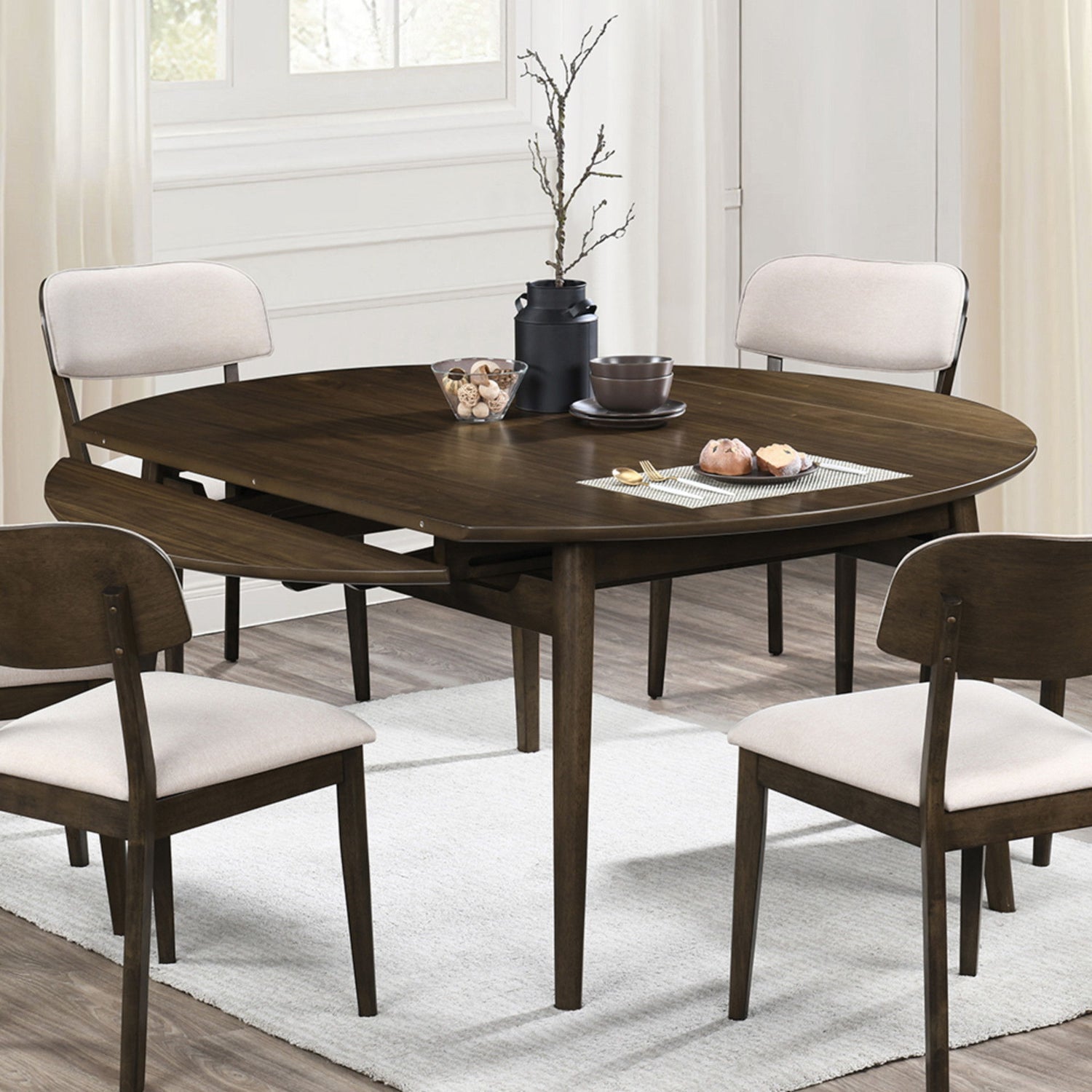 The Rex Mid-Century Modern 65" Round Dining Table with Self-Storing Leaves in Walnut Brown is a versatile and stylish addition to any dining space. Crafted from solid rubberwood, manufactured woods, and oak veneers, this table ensures exceptional stability and longevity. Its classic mid-century modern design features clean lines, rounded edges, and angled, tapered legs, embodying a timeless elegance. The multi-step walnut brown finish, hand-rubbed with a clear topcoat, enhances the natural beauty of the wood grain. This innovative dining table includes self-storing leaves that extend to provide roomy seating for six, making it perfect for both intimate meals and larger gatherings.