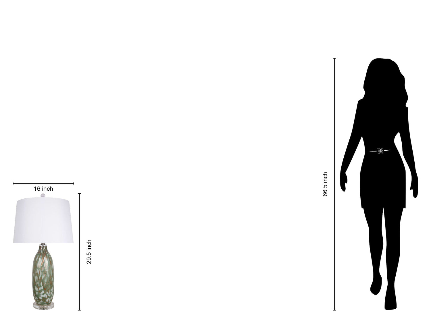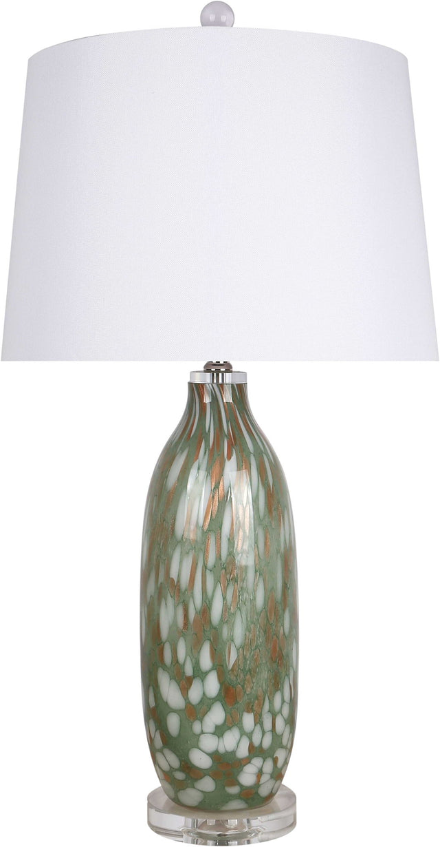The Verdant Glow table lamp brings a touch of elegance to any space with its exquisite art glass base in shades of green, white, and brown. Complemented by clear crystal accents, this lamp offers a sophisticated silhouette perfect for a console or reading nook. The white linen shade softly diffuses light, creating a warm and inviting atmosphere.