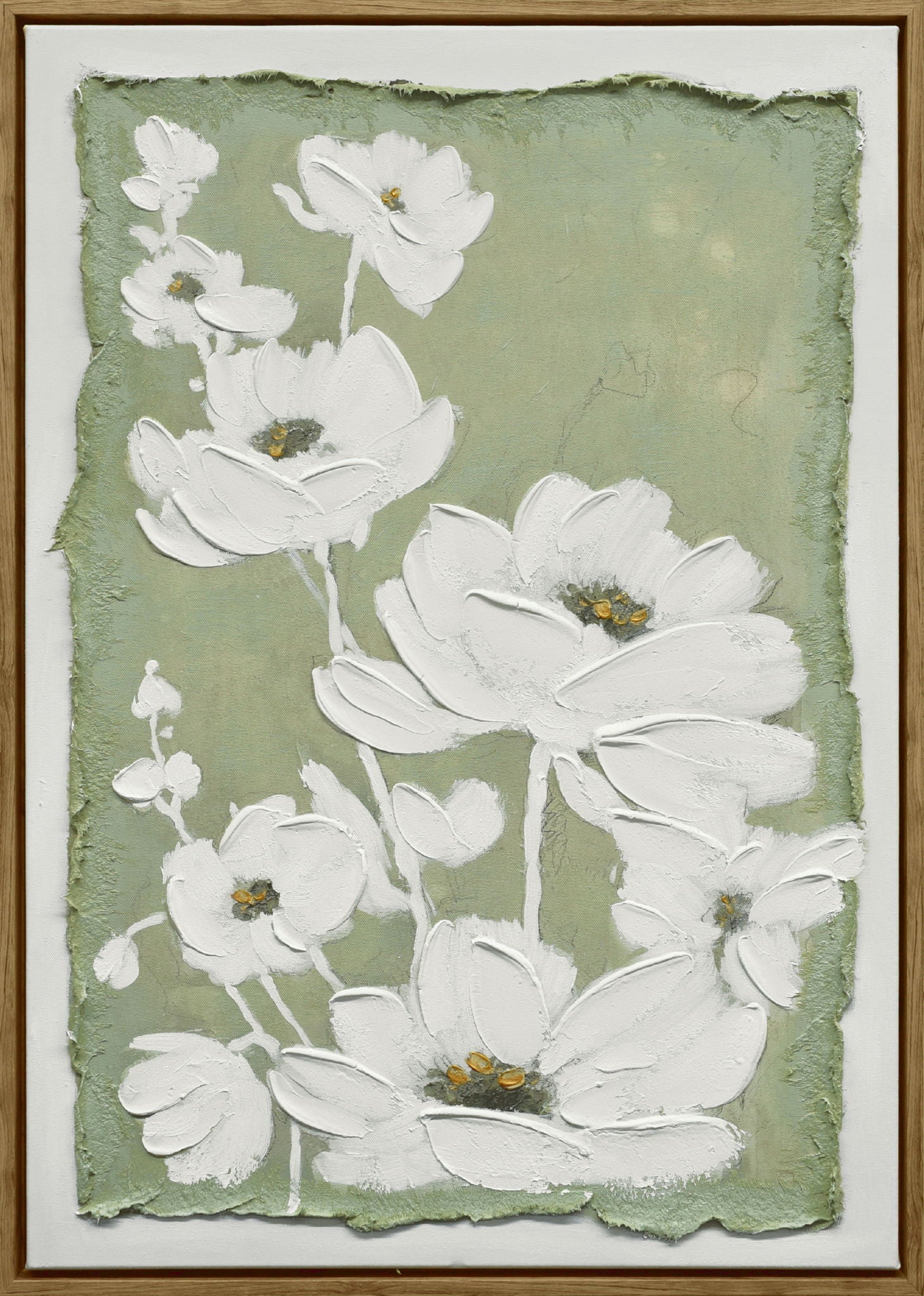 Immerse yourself in the tranquil beauty of 'Blossom Serenity.' This hand-embellished acrylic piece captures the delicate elegance of white blossoms against a soft green backdrop. Perfect for adding a touch of nature's grace to any room, this framed art brings a serene and sophisticated ambiance to your space.