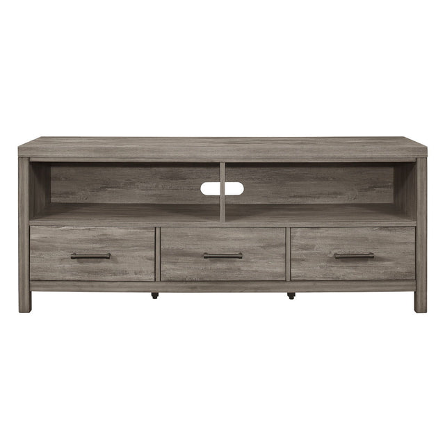 Following the trend of rusticated simplicity is the Bainbridge Collection. Melamine laminate perfectly mimics the look of weathered gray wood, lending to the rustic style. The transitional framing of the TV Stand allows for placement in myriad home settings, creating the perfect canvas for your preferred decorative style. The unit features dual open media console storage as well as three storage drawers, each drawer fronted by black metal bar hardware.