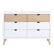 Providing the perfect landing pad for your childs bedroom, the Asker Collection is a fun and functional addition to their space. The two-tone white and natural finish of the pine veneer is paired with the mid-century modern design to create a classic profile. The dresser features a neutral finish on the top drawers, with white fronts on the bottom sets of drawers. Grooved hand openings center each drawer front serving as an easy access point for drawer extension.
