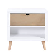 Providing the perfect landing pad for your childs bedroom, the Asker Collection is a fun and functional addition to their space. The two-tone white and natural finish of the pine veneer is paired with the mid-century modern design to create a classic profile. The nightstand features a neutral finish on the top drawer, with an open display shelf below. A grooved hand opening centers the drawer front serving as an easy access point for drawer extension.