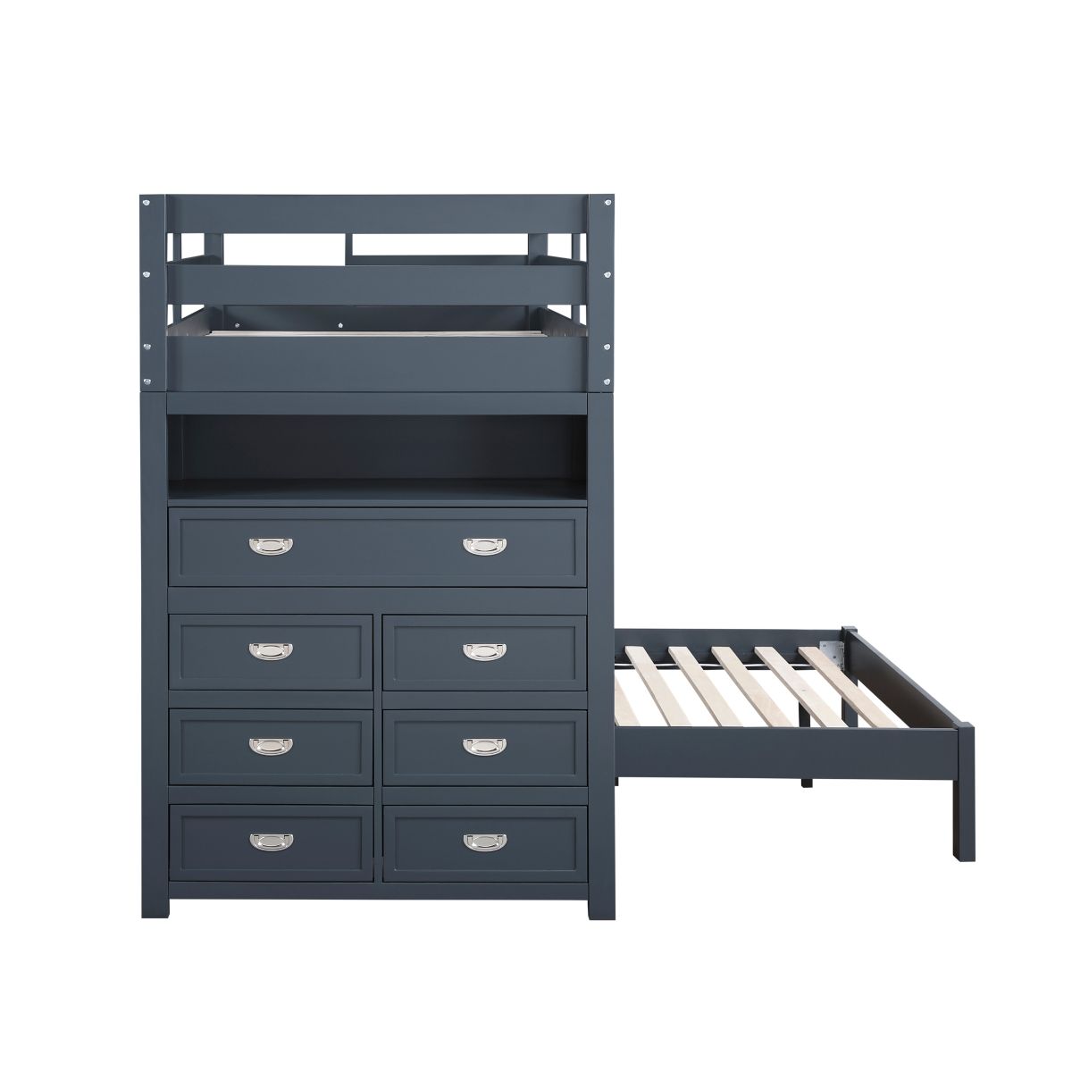 Maximize your child's bedroom space with this multifunctional loft bunk bed, designed for both style and practicality. Crafted from wood and engineered wood with a sleek finish, this bunk bed features a top bunk with guard rails for safety and a lower bed. The built-in storage unit includes seven dovetail drawers with smooth ball-bearing glides for organized storage, and a hidden desk on casters that easily rolls out for study or creative activities. Polished nickel-tone flush ring pulls add a touch of sophistication, and the design eliminates the need for a foundation or box spring, making it a space-saving and efficient choice for any bedroom.
