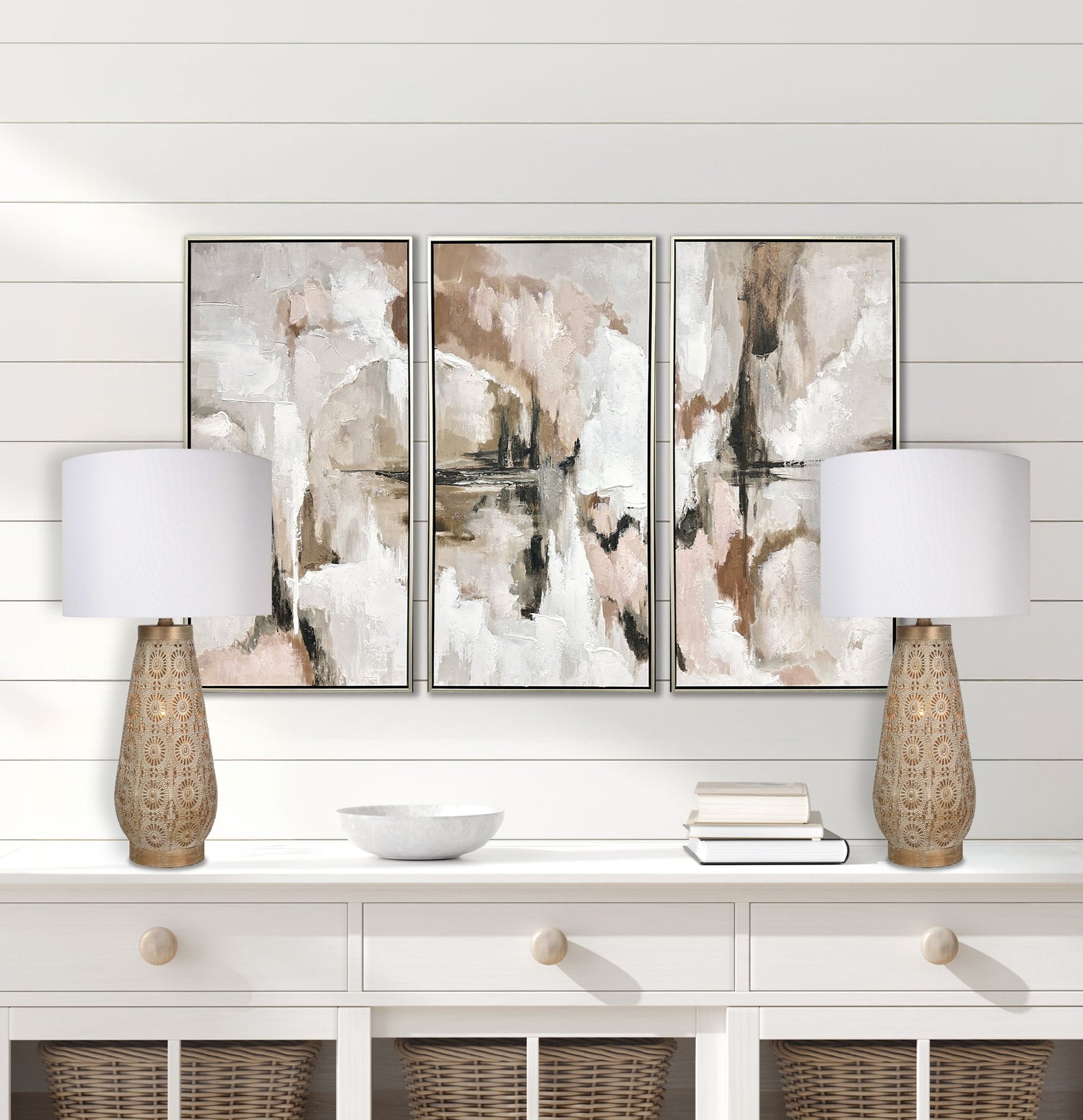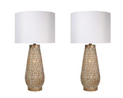 "Celestial Carve" Laser Cut Metal Table Lamp With Night Light (Set of 2) - Distressed White / Distressed Tan
