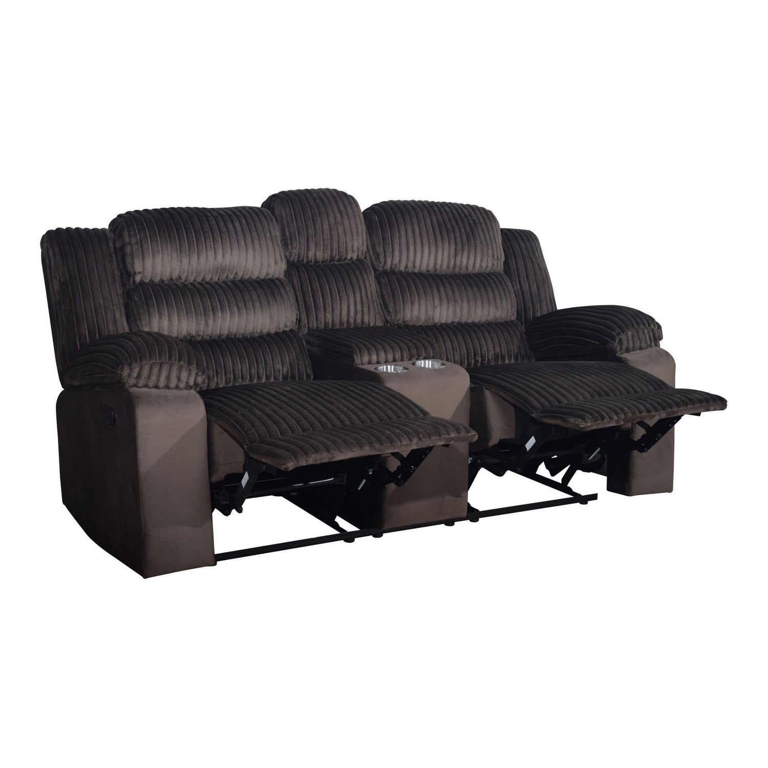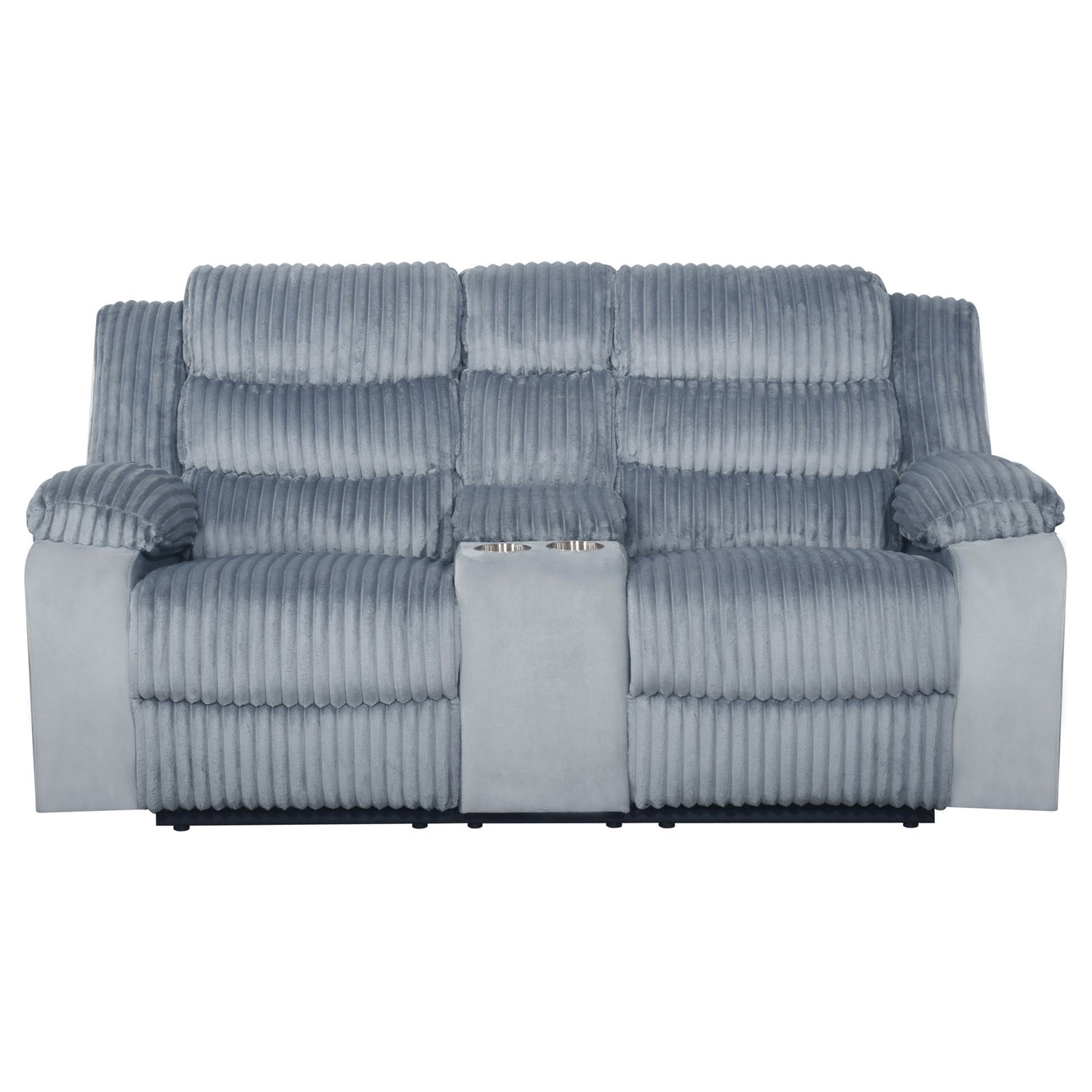 The Willow Console Loveseat is designed to elevate your living experience with a blend of quality construction and modern comfort. Built with hardwood and plywood interior frames and sturdy motion mechanisms, it ensures a long-lasting foundation for your motion furniture. The ultra-soft 100% polyester fabric offers a luxurious blankety-soft texture, inviting you to indulge in ultimate relaxation. Its supportive seating combines a spring structure with plush foam, providing consistent comfort and maintaining the sofa’s shape over time. The contemporary design includes clean lines, plush ribbed upholstery, and a relaxing reclining mechanism, making it an ideal choice for any living space. The sofa features two recliners with plush cushioning, perfect for living rooms and home theaters. Additionally, the center console includes storage for remotes or books and built-in drink holders for your convenience, enhancing your lifestyle.