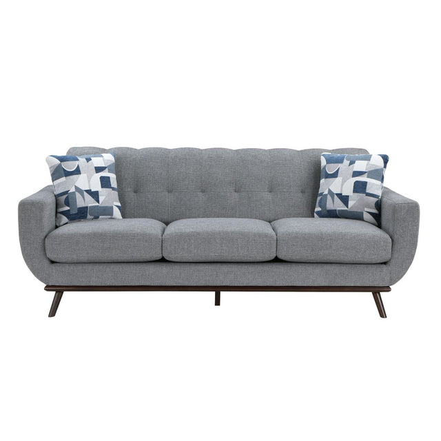 Mid-Century Modern inspired design comprises the timeless look of the Everton Collection. Chenille covers the modern framed sofa with geometric print toss pillows, walnut-finished wood base rail and legs providing complementing accent to the group. Contour stitching lends scalloped detail to the seatbacks profile, and front, while the prominent framing of the collections arms solidifies the retro-inspired form. The collection also features reversible seat cushions.