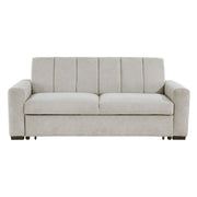 Serving to expand the available sleep space within your home, the Michah Collection conveniently transitions from sofa to bed. When engaged, the click-motion mechanism of the sofa back lays flat, pairing with the pull-out bed to create a solid sleep platform. The transitional style and light gray textured fabric upholstery that covers the sofa serve as a neutral complement to your homes dcor.