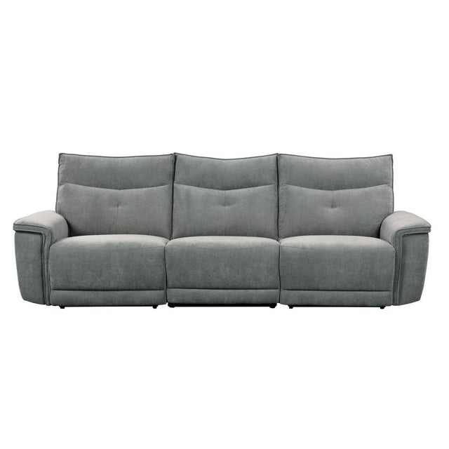 Providing ample seating in modern form the Tesoro Collection. The classic sofa is book-ended by USB port enhanced end power recliners allowing for maximum versatility when planning the layout of your living room. Dark gray fabric provides a neutral palette for your decorative preferences. The power reclining mechanism of the reclining ends and armless chair brings you to your desired position with a touch of the button.