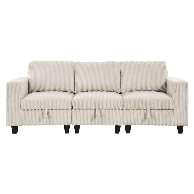 The multifunctional design of the Walterboro Collection creates a seating group that is not only configurable to your available space but serves as a convenient storage spot within your casual living room. Pull-out storage drawers are neatly tucked beneath the armless chair and end seats of the sofa, each drawer easily accessible with a pull to the front-mounted loop handle. The paired end seats arm's provide side support and power charging ports. The collection is covered in corduroy fabric for a neutral complement to your homes dcor.