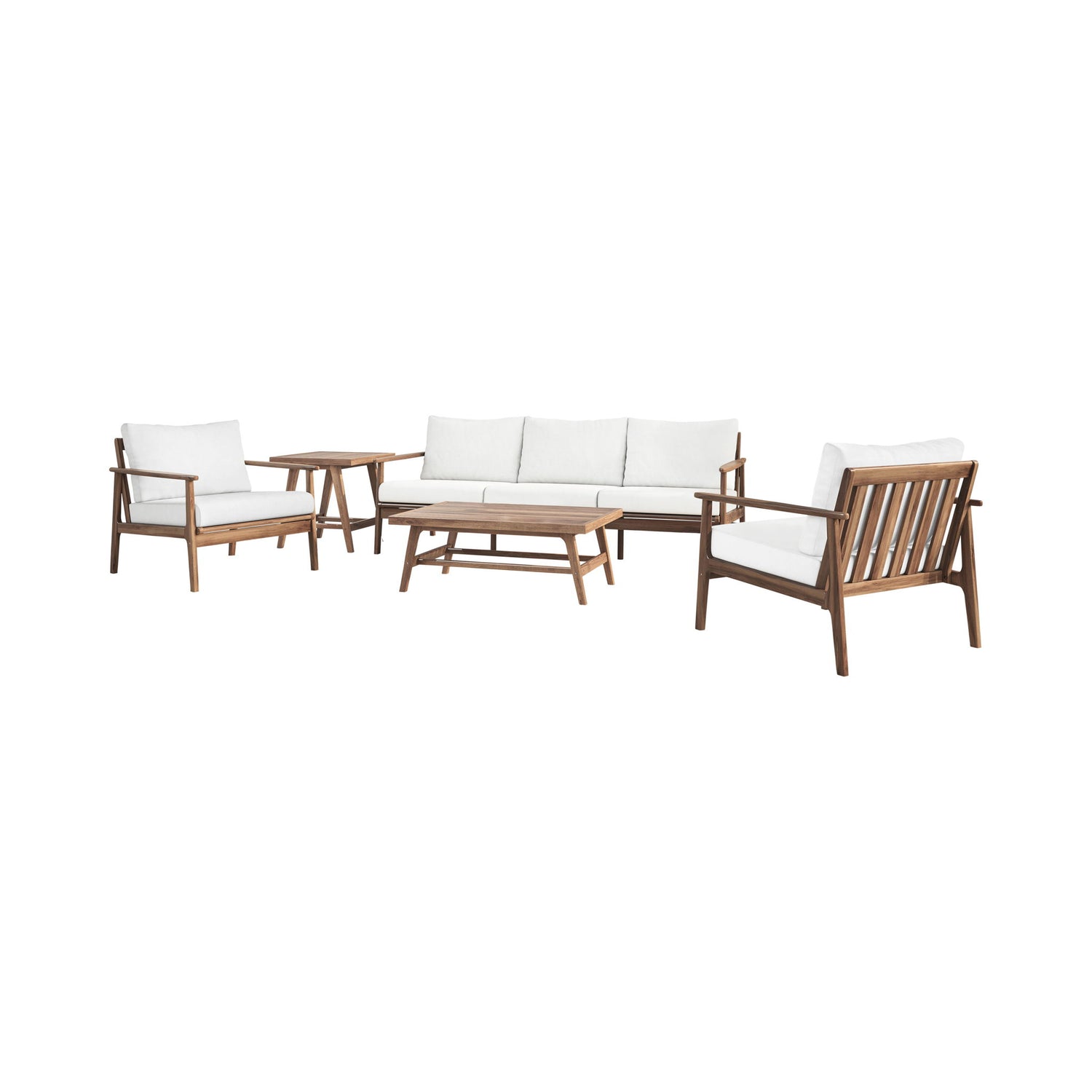 The Ashton Patio Set seamlessly blends durability, comfort, and timeless design to create the ultimate outdoor retreat. Expertly crafted from FSC-Certified Acacia solid wood, this set offers exceptional strength and natural resistance to the elements, ensuring long-lasting beauty and reliability. A meticulously applied light, clear multistep finish enhances the wood''s rich texture and color while adding a protective layer for superior outdoor durability. The sofa is designed for lasting comfort with plush, high-density 12cm foam seat and back cushions, upholstered in exclusive Sundura™ fabric—a solution-dyed 100% polyester that resists fading, mildew, and moisture, keeping the set vibrant and fresh year after year. With clean, straight lines, slatted backs, and a low-profile frame, this minimalist design delivers sleek functionality and modern elegance. The slatted tabletop not only adds a classic touch but also improves water drainage for practical outdoor use. Each piece showcases one-of-a-kind wood grain variations, offering unique patterns and organic details that bring timeless beauty and authentic charm—ensuring no two pieces are ever exactly alike.