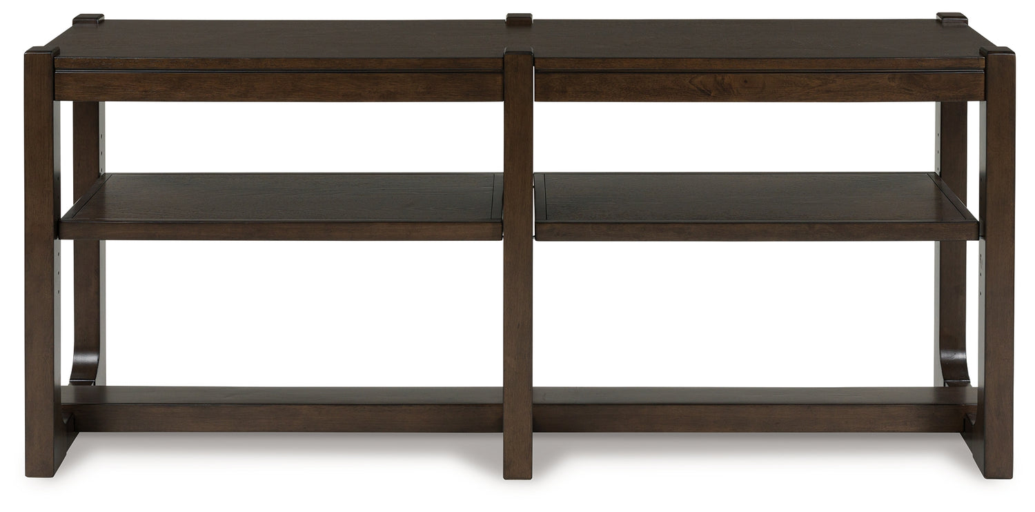 If casual contemporary style is your thing, then you'll love this sofa table. A wood-tone finish with a rich, dark grain contrast lends a soothing sensibility, while two independent adjustable shelves add function to great form. Sleek and stylish, this versatile piece is also ideal as a TV stand or console bookcase. What a fresh take on cool for the modern home.
