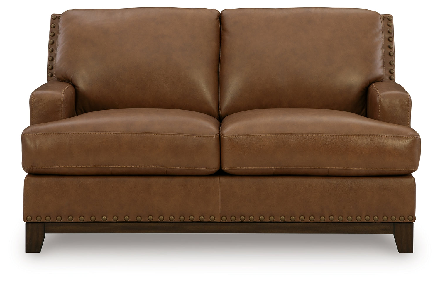 - 100% top grain leather covers the cushion top; skillfully matched faux leather covers the remaining areas