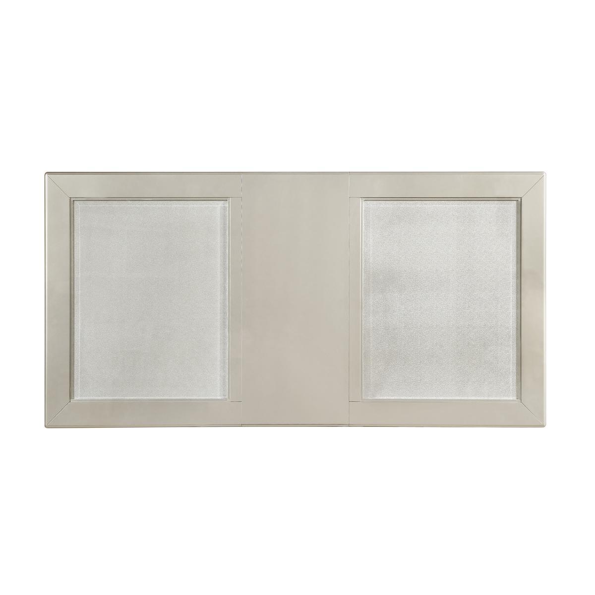 Blending traditional lines with modern glamour is the Crawford Collection. Finished in an eye-catching silver, the dining table will be a dramatic addition to your homes dining room. Cabriole legs and insert glass panels lend traditional accent.