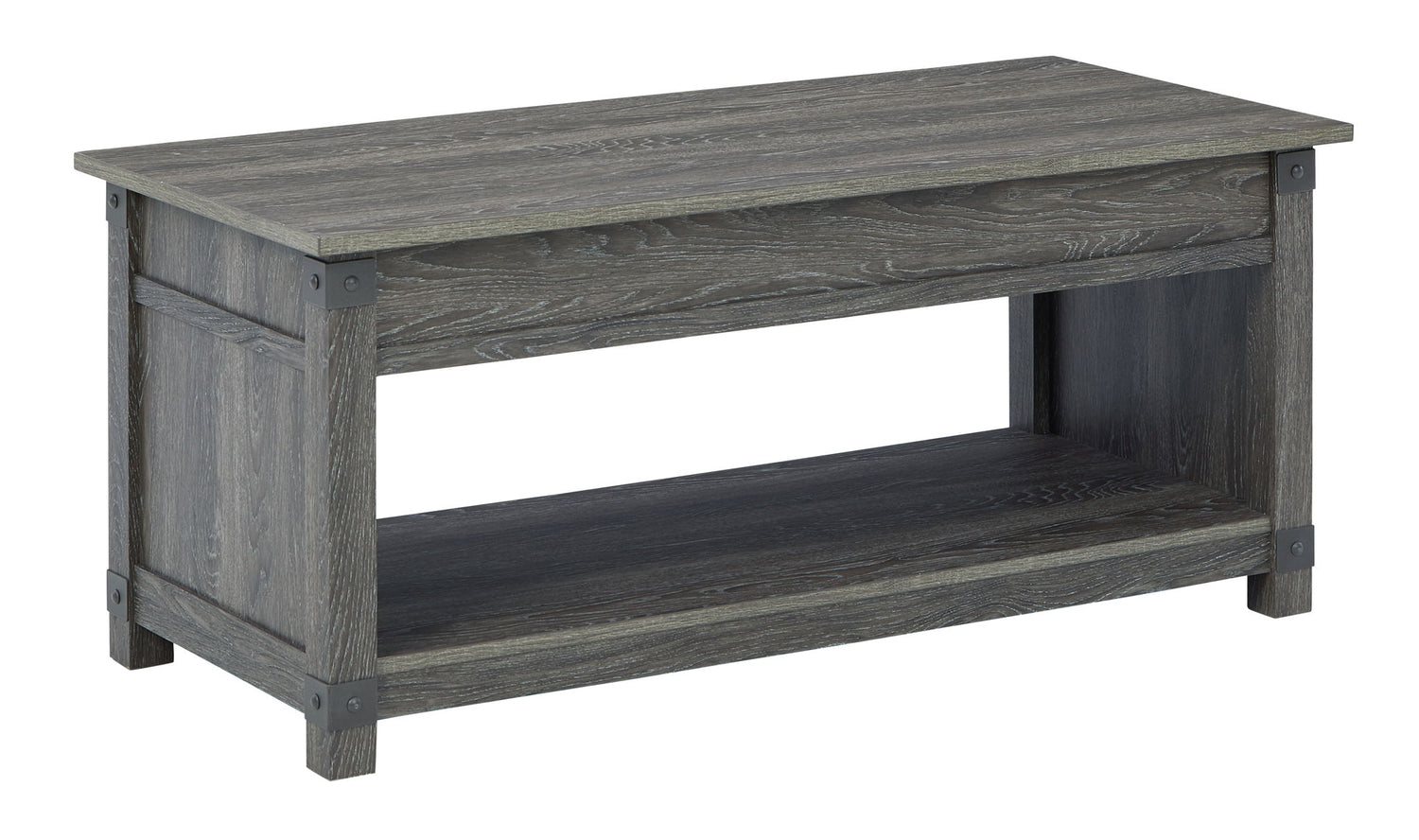 Raise the bar on modern farmhouse design with this accent table set. Sporting a grayish brown replicated wood grain effect, the coffee table's handy spring-loaded mechanism brings the tabletop closer to you. This versatile table makes it easier than ever to eat, work or play from the comfort of your sofa. A pair of coordinating end tables completes the set in style.