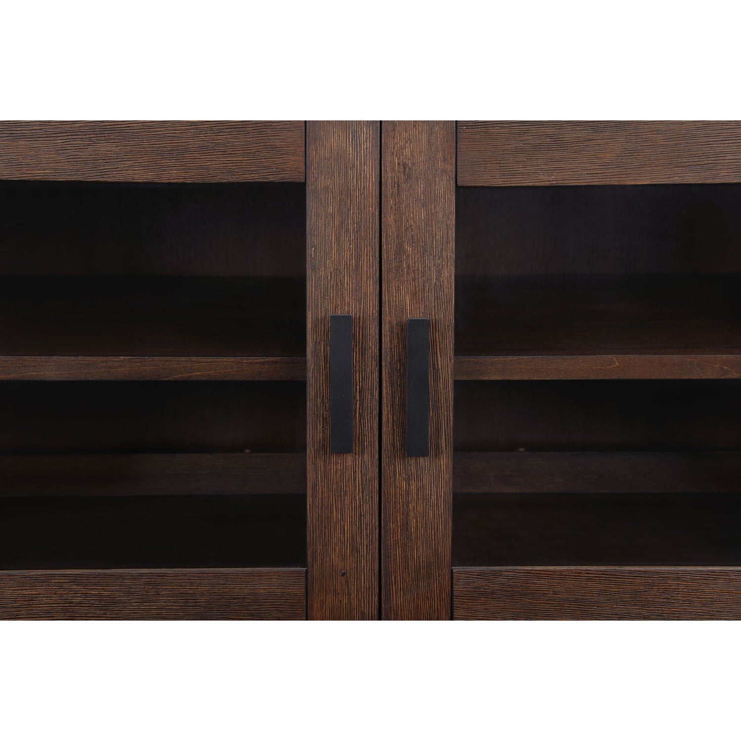 The Arusha TV Stand effortlessly blends rustic style with modern amenities. A rich medium cherry finish is accented by riveted black metal brackets and distressed wood scoring for a beautiful home entertainment hearth that will balance and center any room. The low-profile design places your television at the perfect viewing angle while offering a combination of fixed and adjustable shelves ample space for electronic storage, all while ensuring open sight lines for uninterrupted remote signal access. This stand serves not just as a home for your TV, but as a harmonious centerpiece for any room.