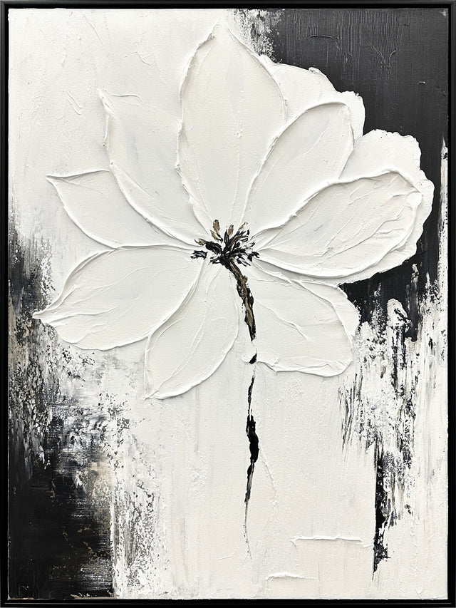 Evoke a sense of tranquility with the 'Ethereal Blossom,' a stunning hand-painted oil piece that captures the delicate beauty of a single flower in monochrome. The textured petals stand out against a contrasting background, making it a captivating centerpiece for any room. Perfect for adding a touch of elegance and serenity to your living space.