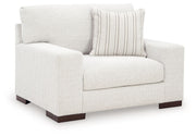 Easy on the eyes and irresistibly comfortable, this oversized chair blends beautifully into any setting. Contemporary wide track arms and plush cushions covered in soft, stain resistant Next-Gen Nuvella™ upholstery lend this piece a sense of everyday ease. A simple striped accent pillow in complementary colors adds subtle contrast.