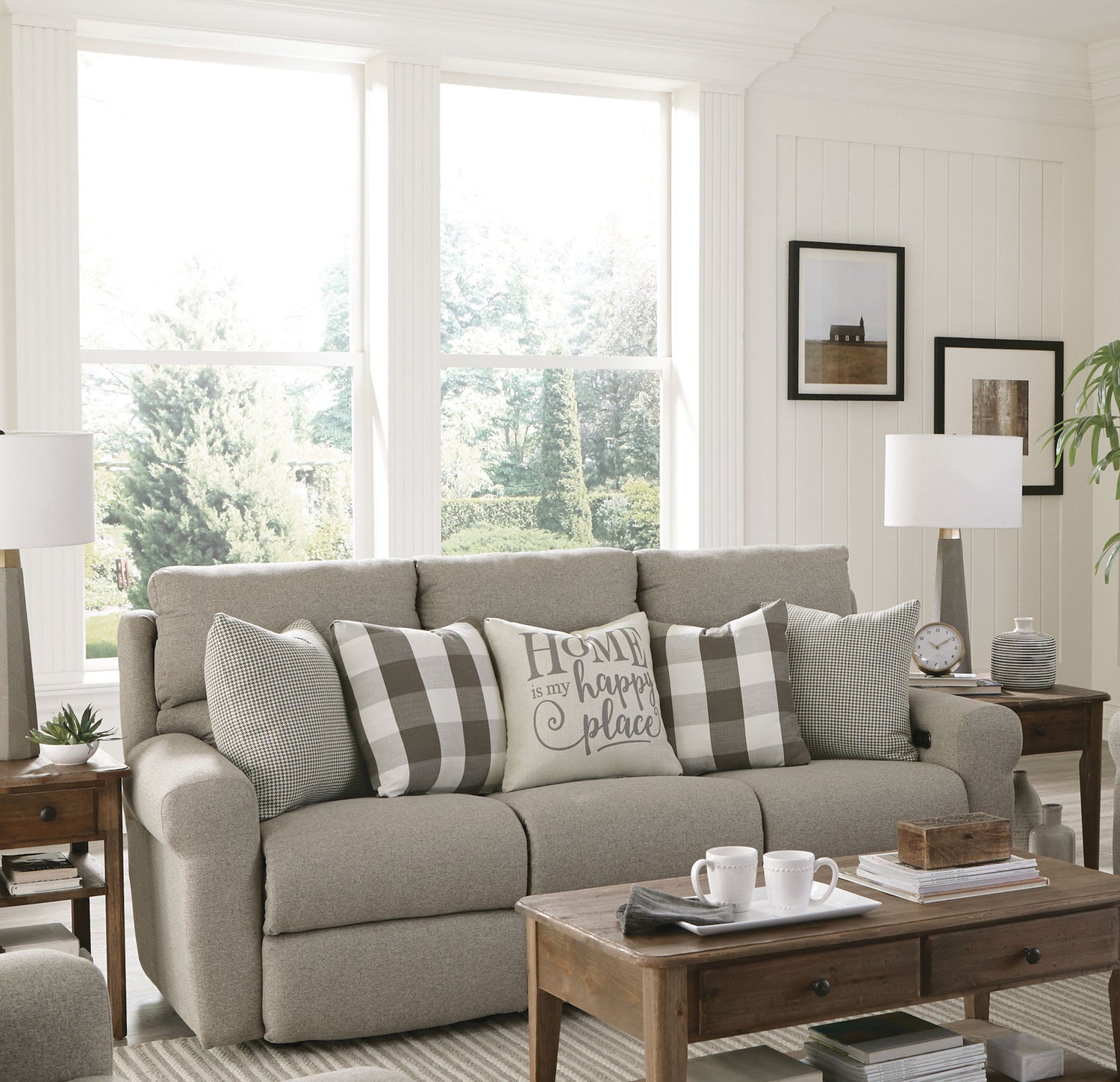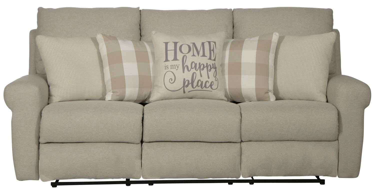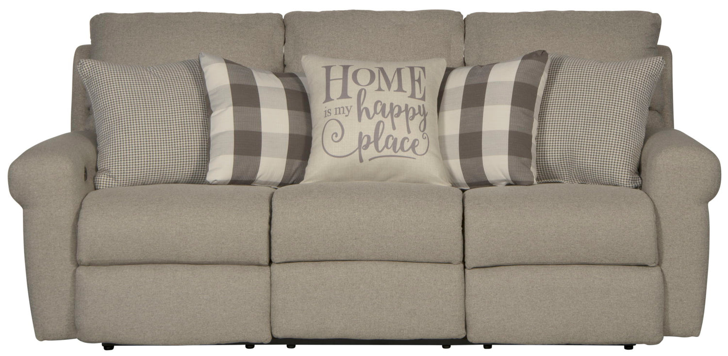 The WESTPORT power lay flat reclining sofa features a Farmhouse Casual style with its Greek Key arm treatment, soft body fabric, and 5 included accent pillows.